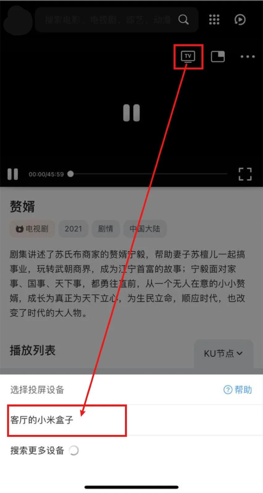 打开QQ浏览器(会接管网页播放器)->打开AcgnEx->播放视频->选中投屏图标->等待搜寻出智能电视/电视盒子->选中,即可投屏。